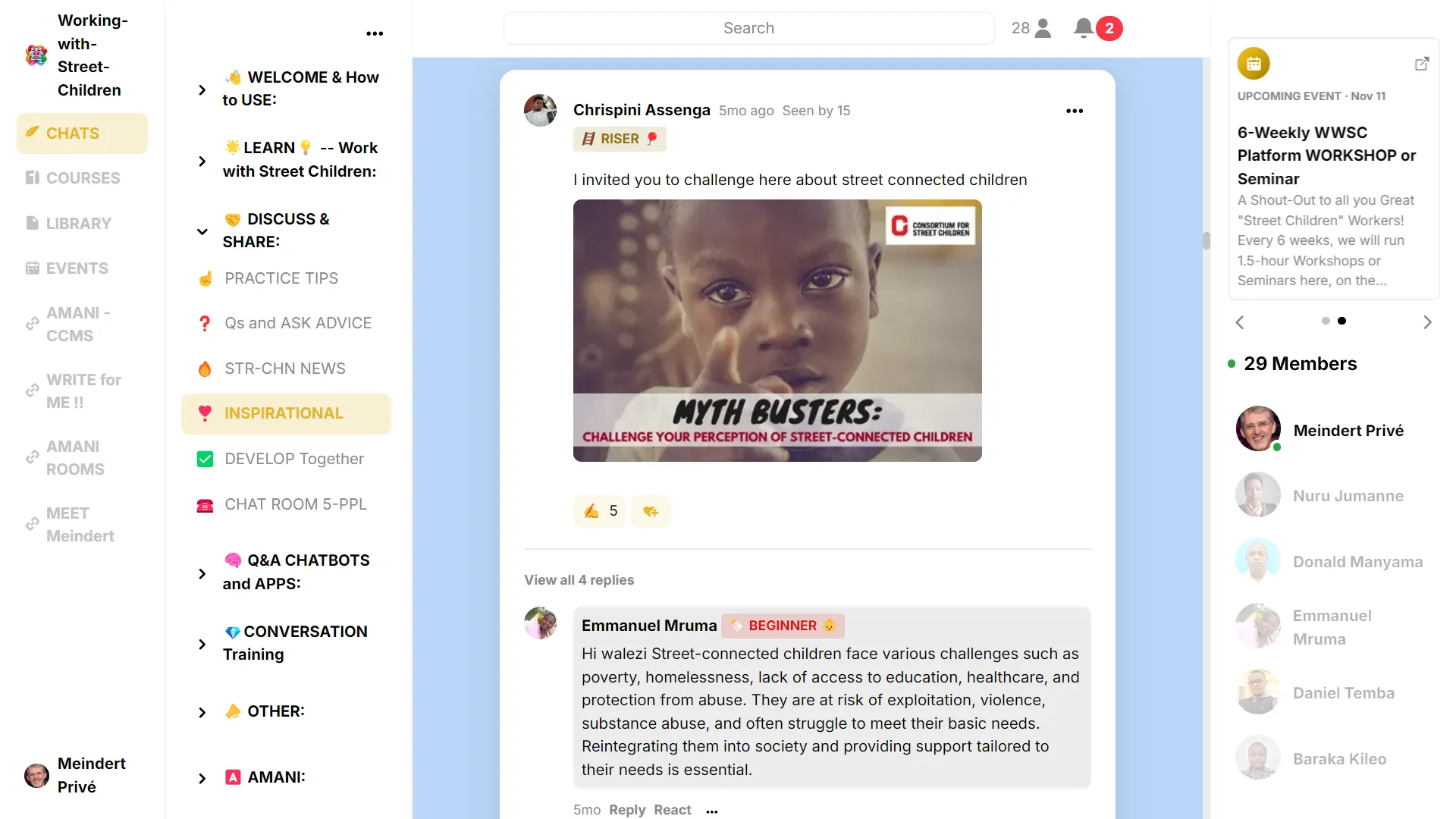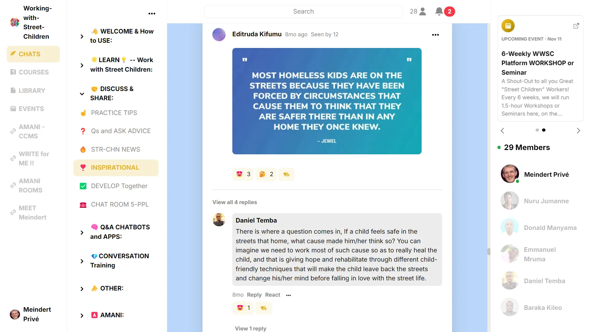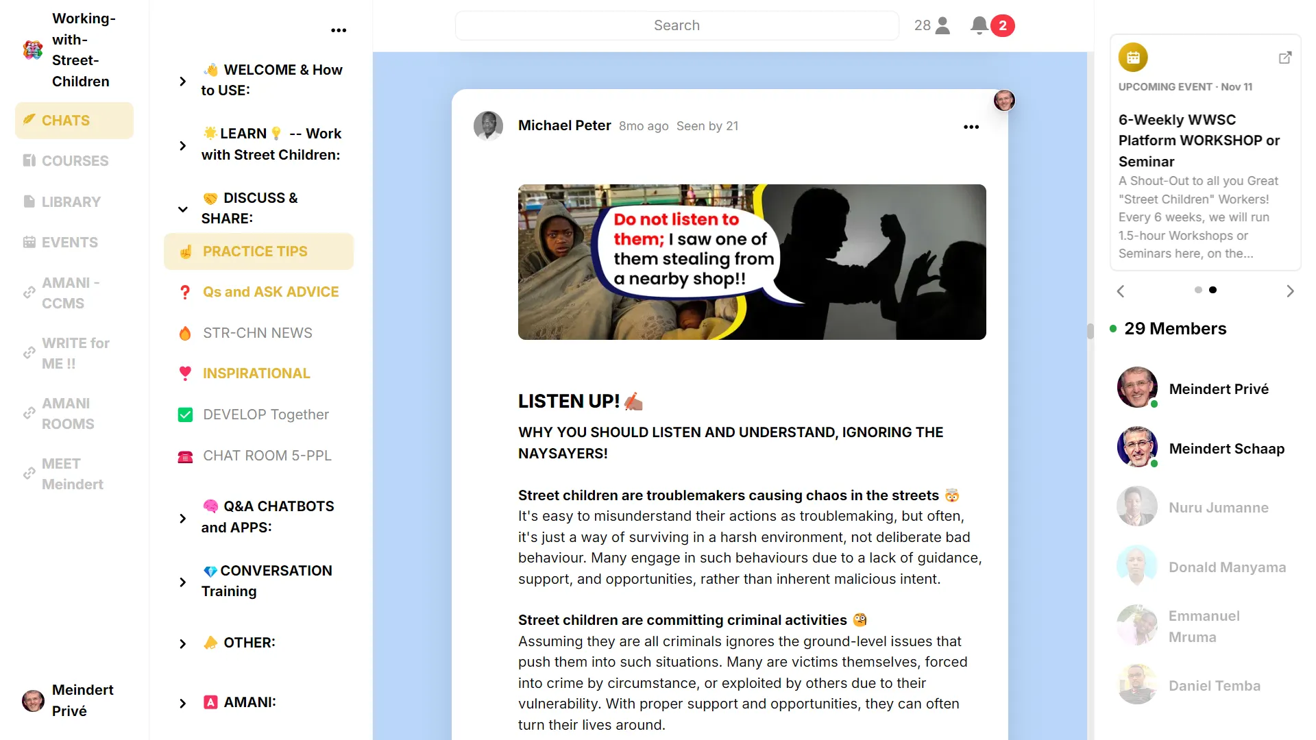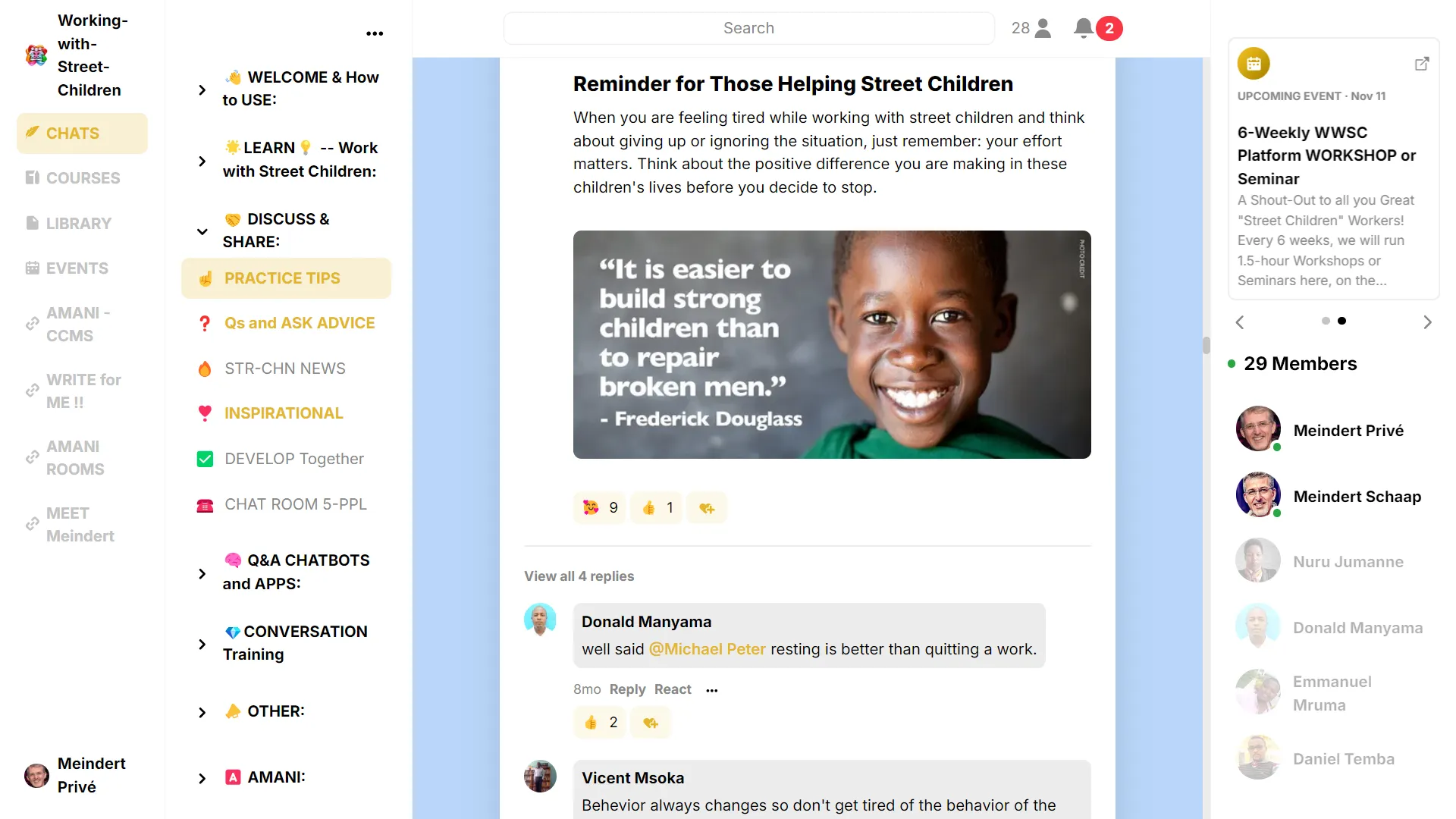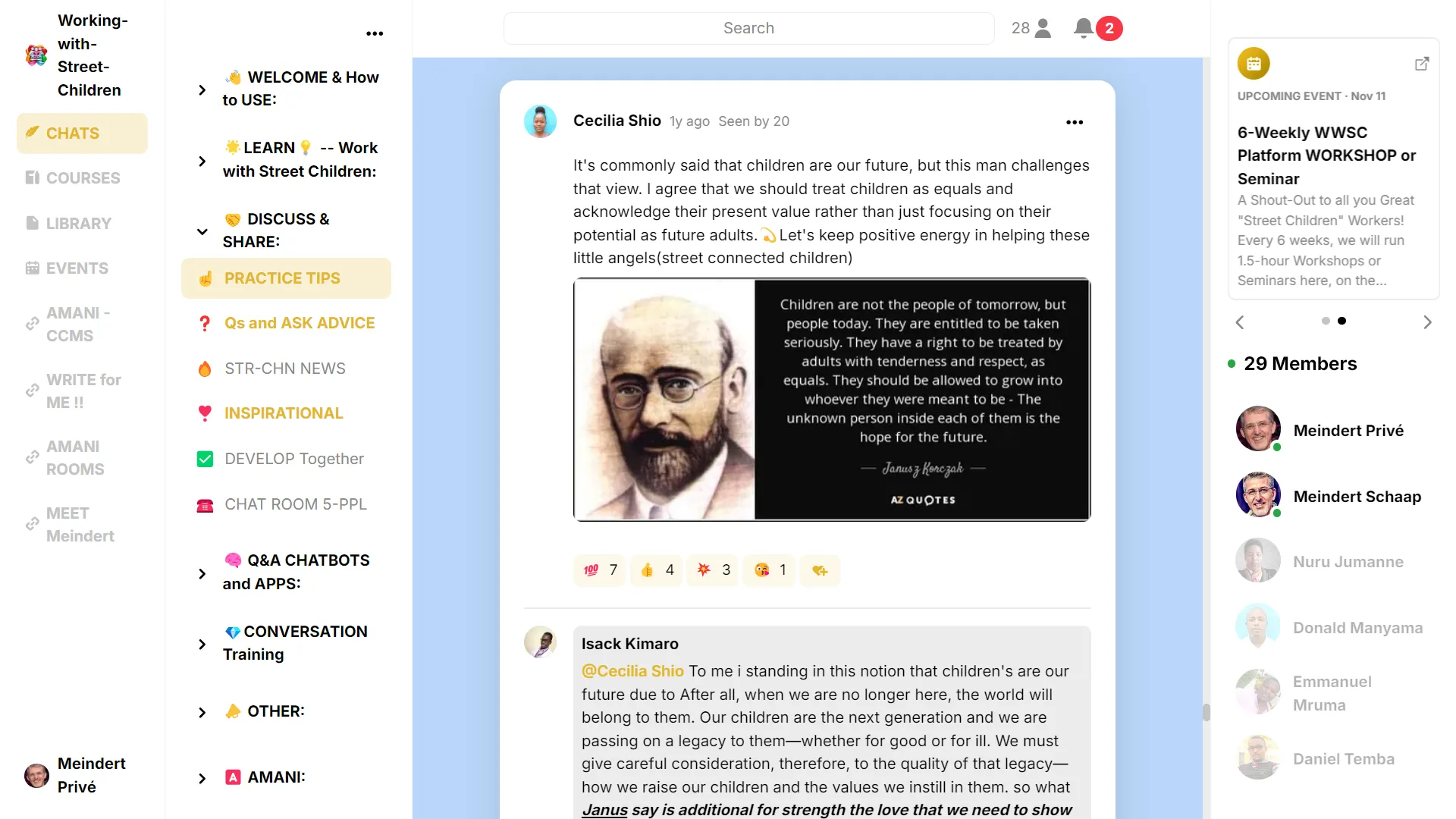 To give you a first idea of what the Community features look like in our Working-With-Street-Children platform, take a scroll through these: