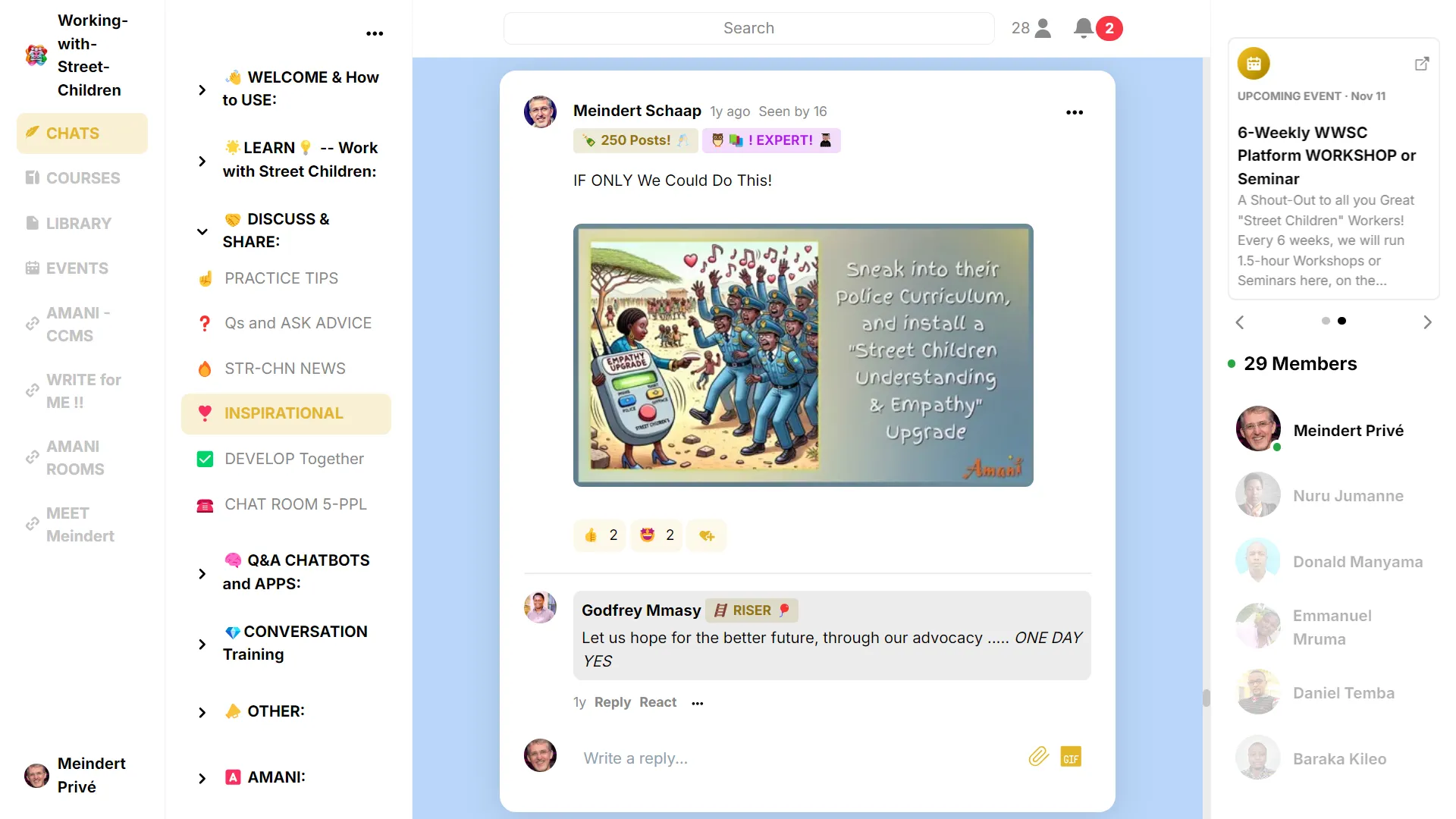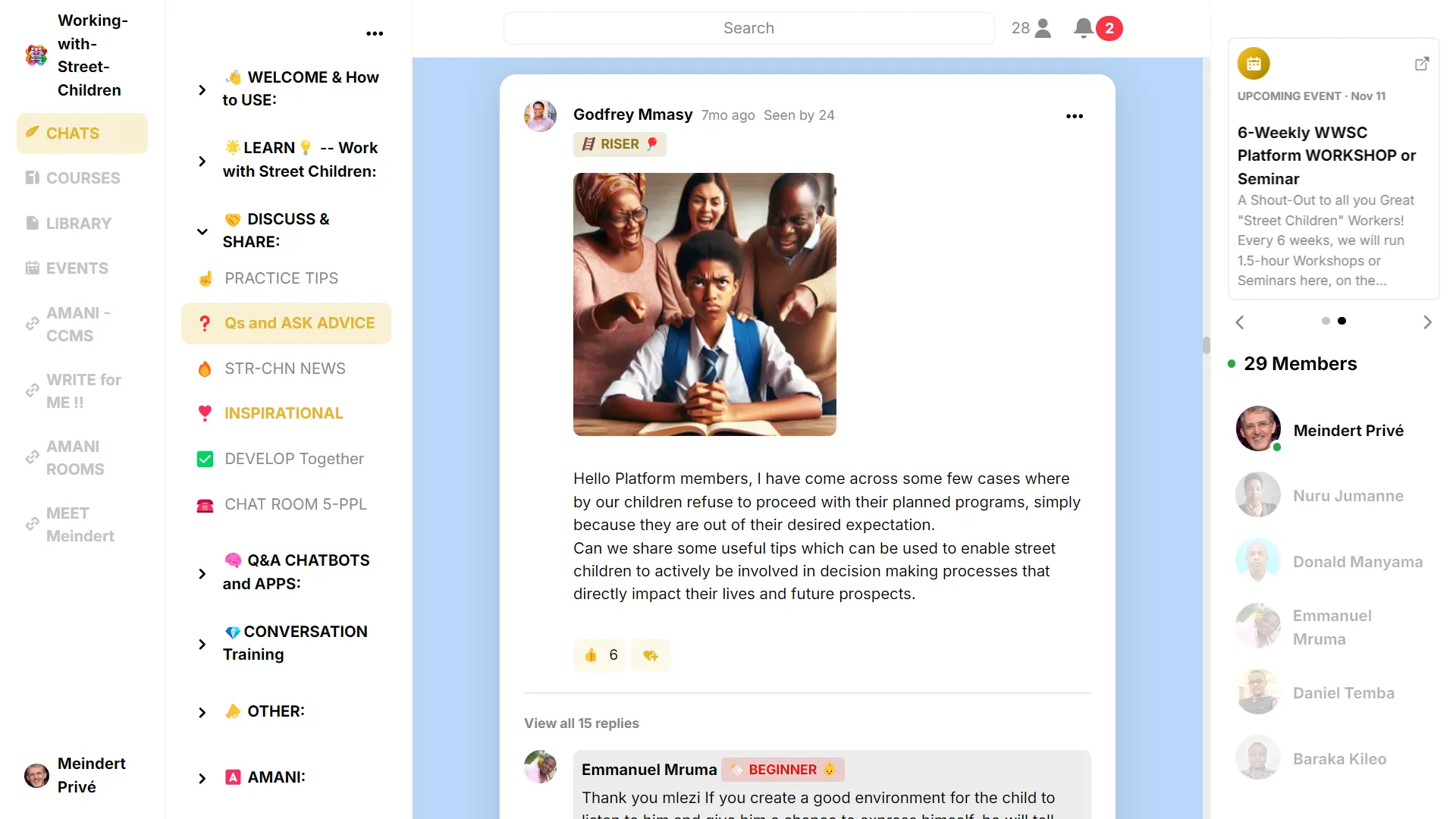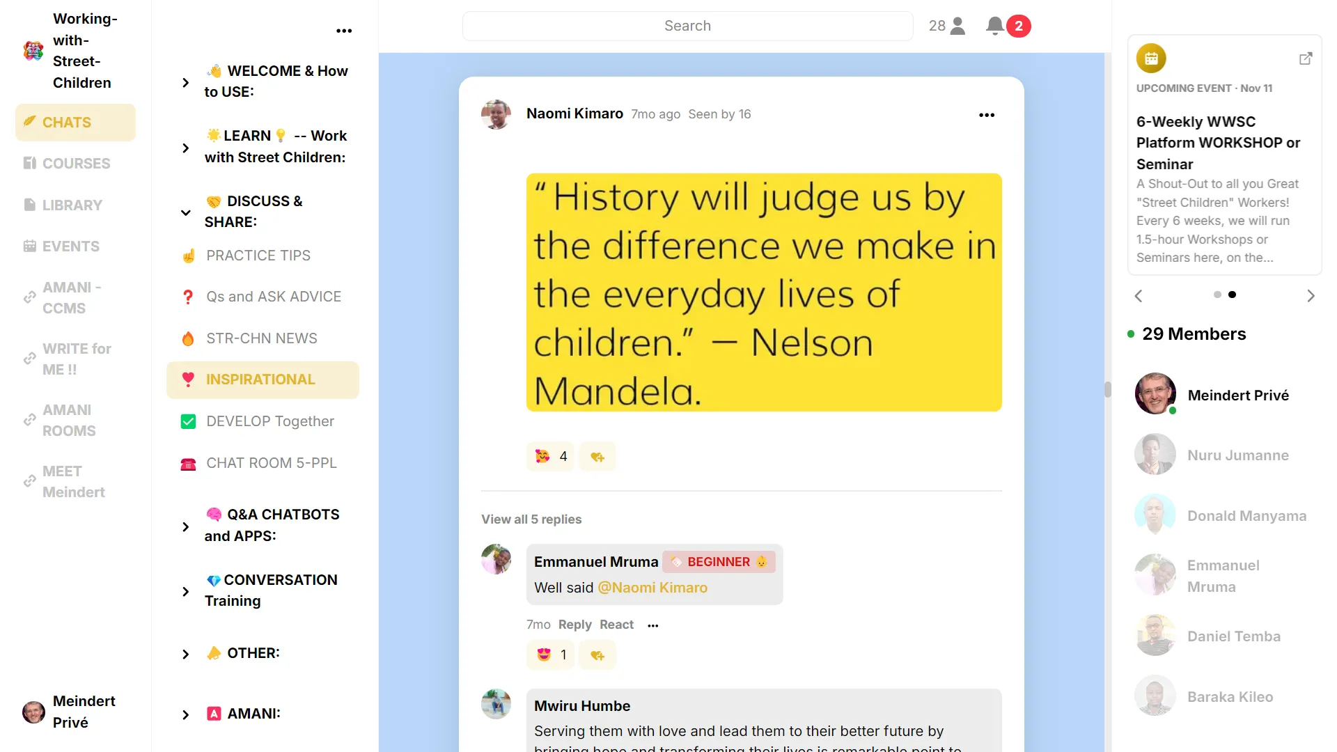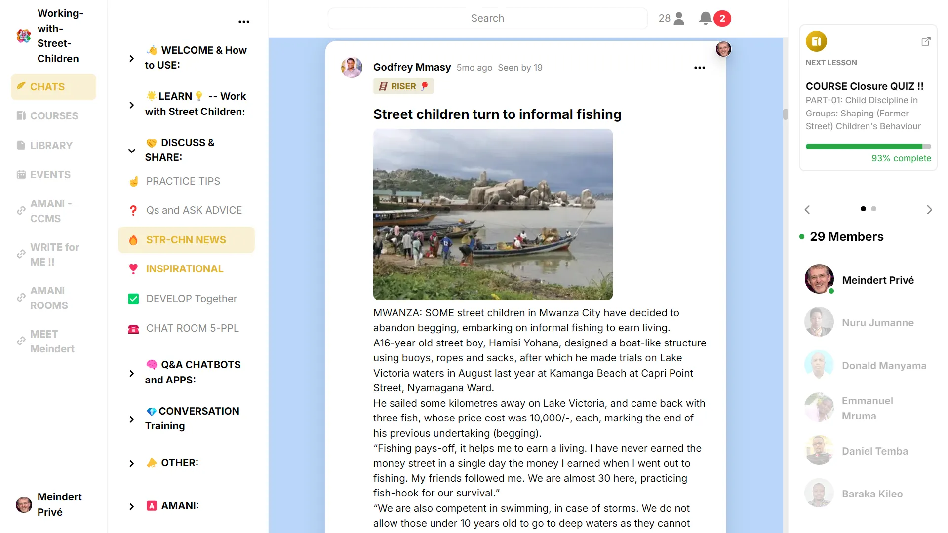 To give you a first idea of what the Community features look like in our Working-With-Street-Children platform, take a scroll through these:
